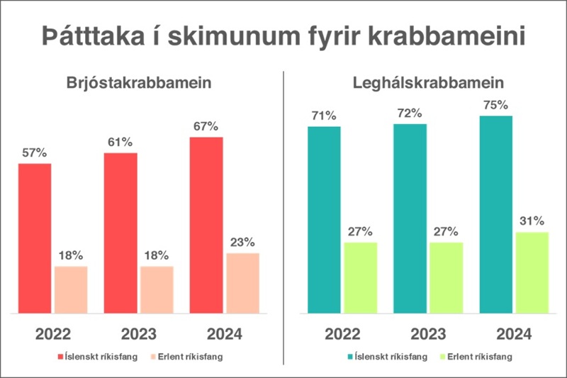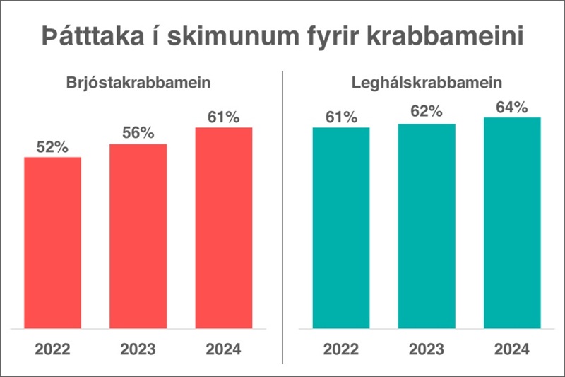Þátttakan í skimun fyrir leghálskrabbameini hefur einnig aukist milli ára. Í fyrra tóku 64 prósent þátt en 62 prósent árið 2023. Konur á aldrinum 23 til 64 ára fá reglulega boð í leghálsskimun. Skimunin fer fram á heilsugæslustöðvum um land allt.